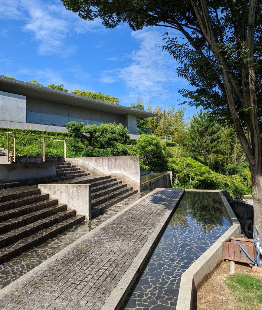 A beautiful fountain/staircase below the concrete gallery building